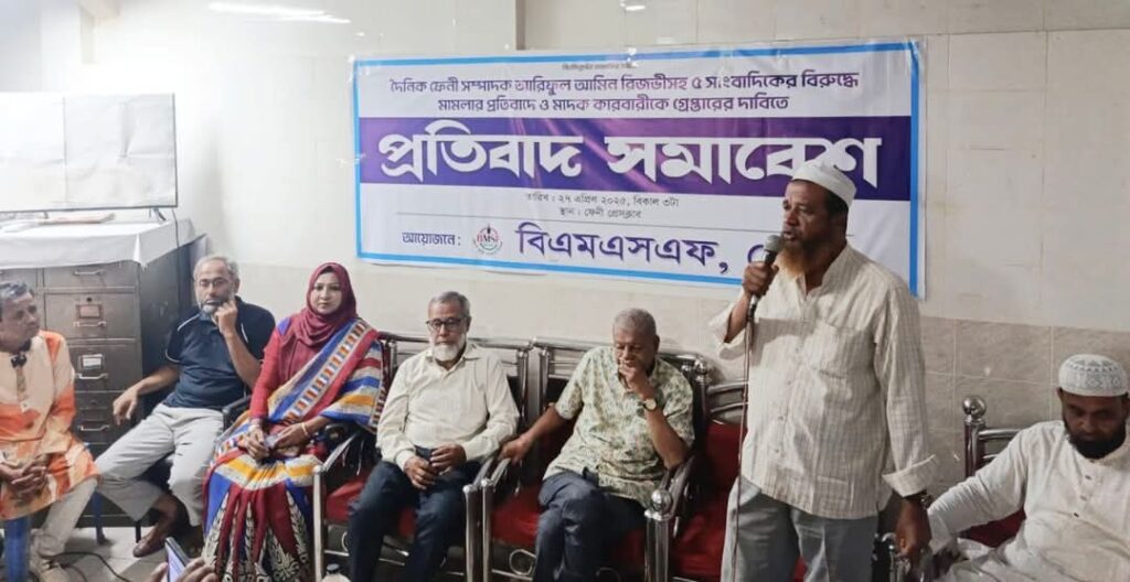 প্রতিবাদ সভায় বক্তারা বলেন, “অপরাধ স্বীকার করার পরেও সাংবাদিককে হয়রানি করতে মিথ্যা মামলা দায়ের করা হয়েছে। আমরা দ্রুত এই মামলা প্রত্যাহার এবং দায়ীদের আইনের আওতায় আনার দাবি জানাচ্ছি।”